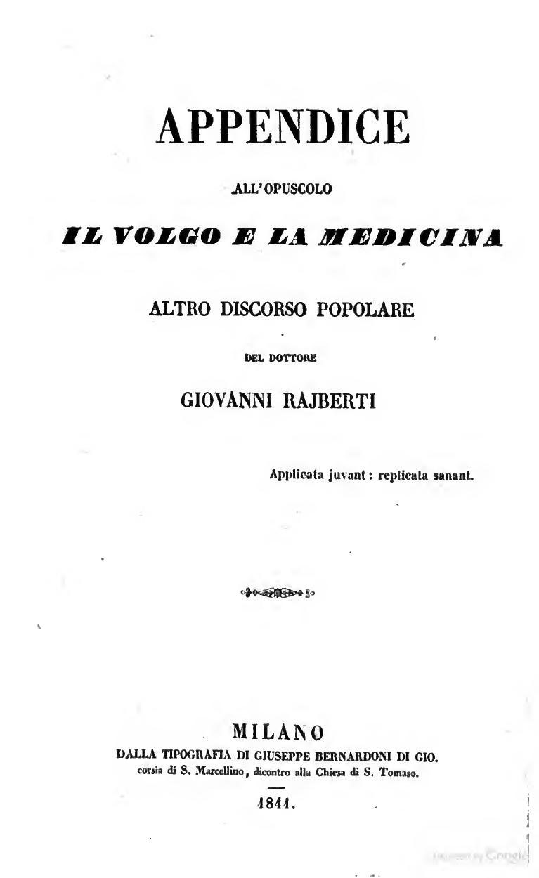 Il volgo e la medicina. Altro discorso popolare del dottore Giovanni Rajberti