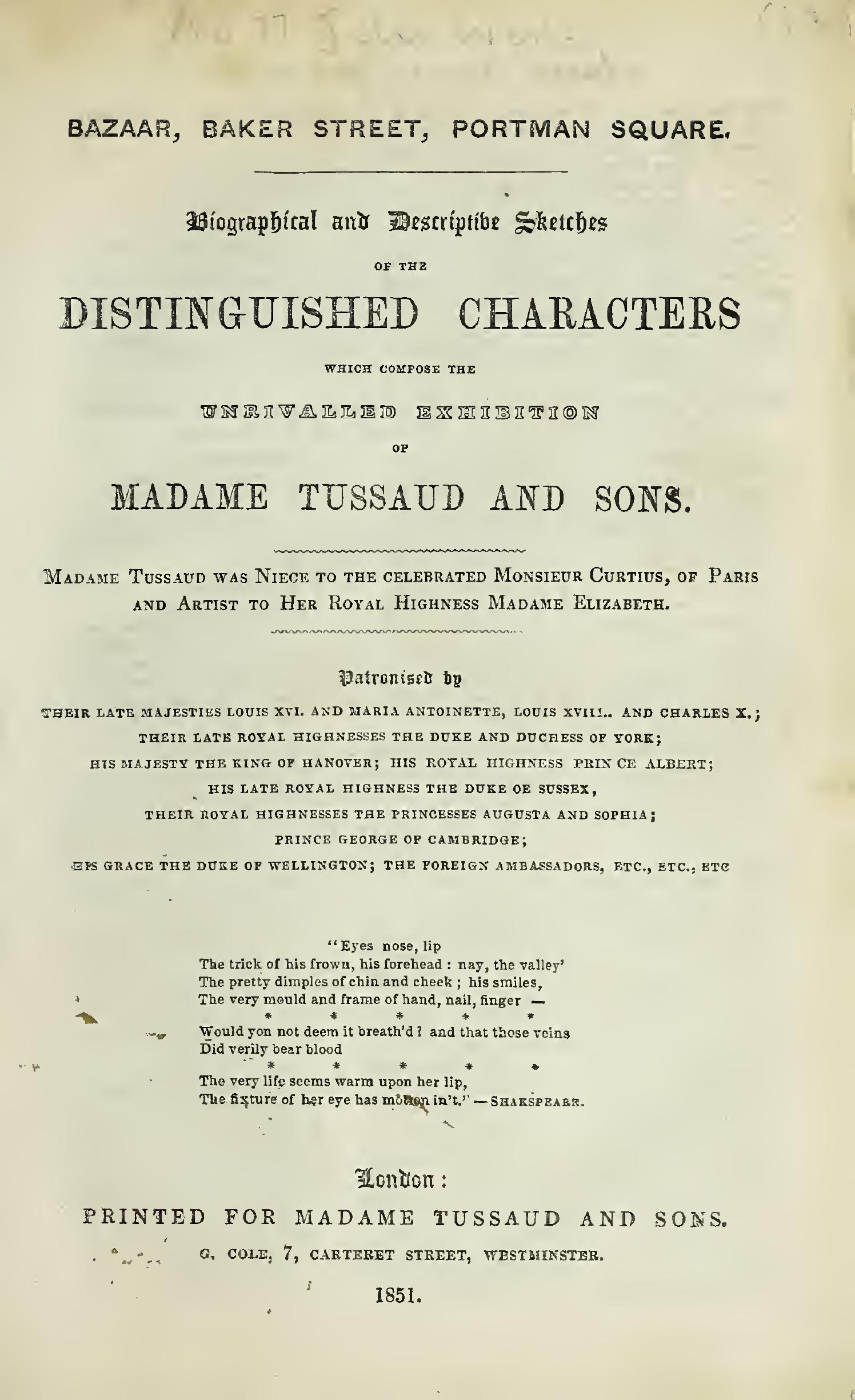 Biographical and descriptive sketches of the distinguished characters which compose the unrivalled exhibition of Madame Tussaud and Sons