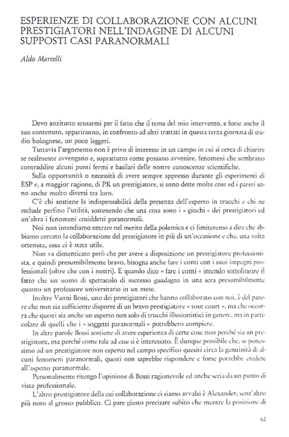 Esperienze di collaborazione con alcuni prestigiatori nell’indagine di alcuni supposti casi paranormali