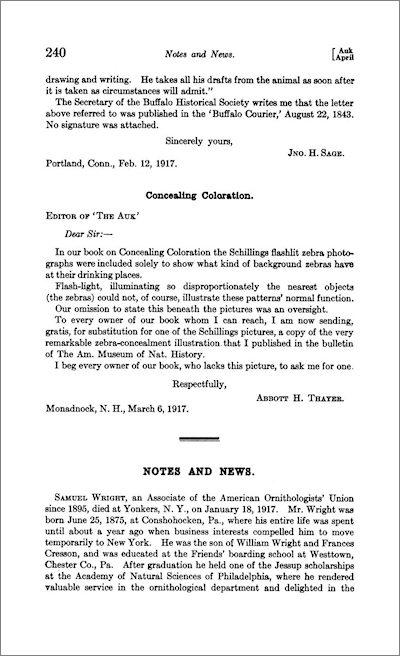 The Auk, Vol. 34, American Ornithologists' Union, aprile 1917, p. 240.