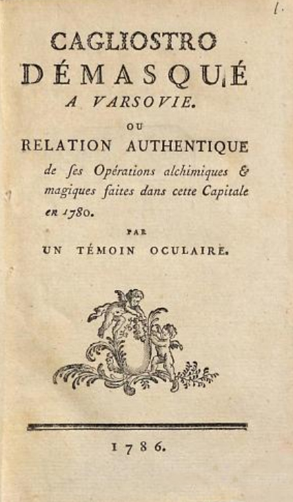 Cagliostro démasqué à Varsovie, ou relation authentique de sés operations alquemiques et magiques, faites dans cette capitale en 1780 par un témoin ocultaire