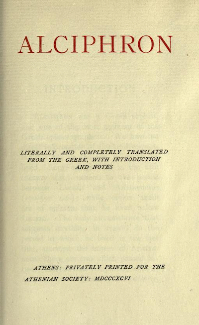 Alcifron, literally and completely translated from Greek, The Athenian Society, Athens 1896.
