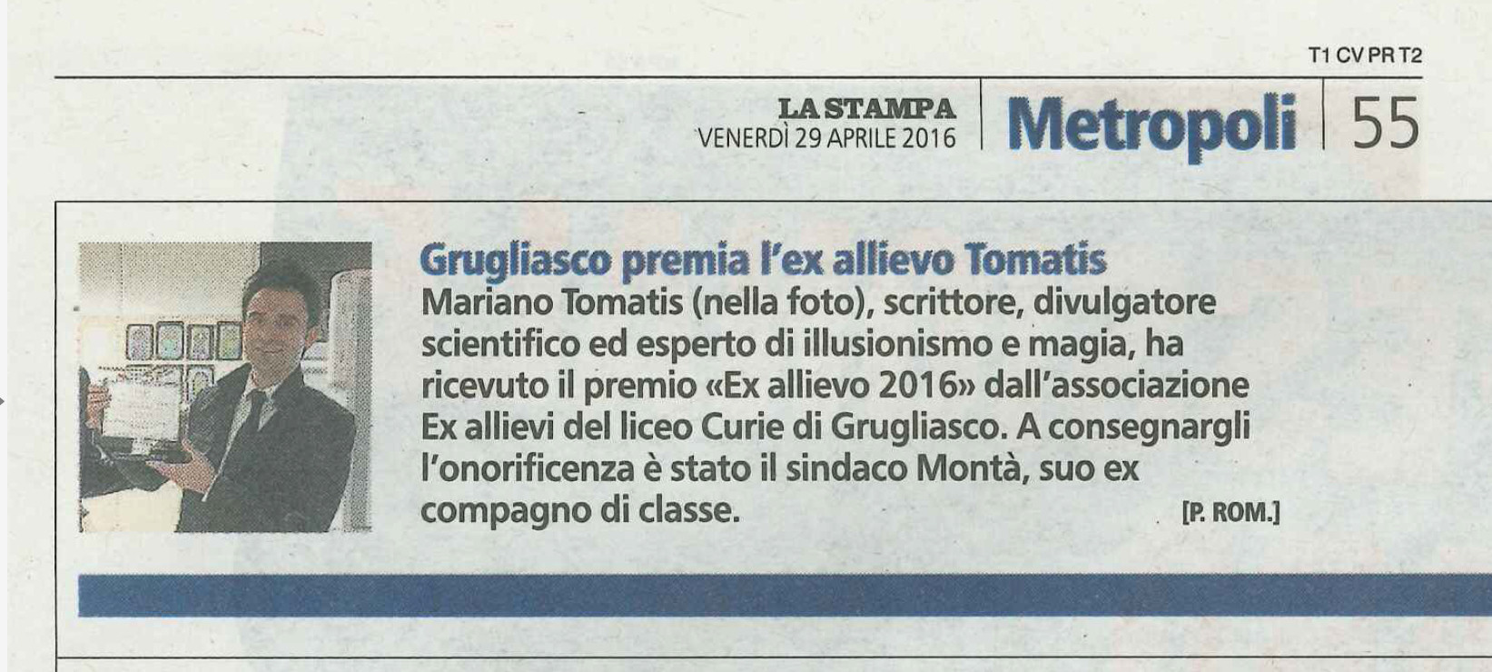 Ringraziando l’Associazione Ex-Allievi del Liceo Marie Curie per questo riconoscimento non posso non partire dal paradosso di fondo: un istituto intitolato alla Scienza premia un ex studente che si è distinto nel campo della Magia. Mentre sarebbe normale se questa fosse la scuola di Harry Potter, in un complesso che porta il nome di Marie Curie il paradosso va spiegato.
