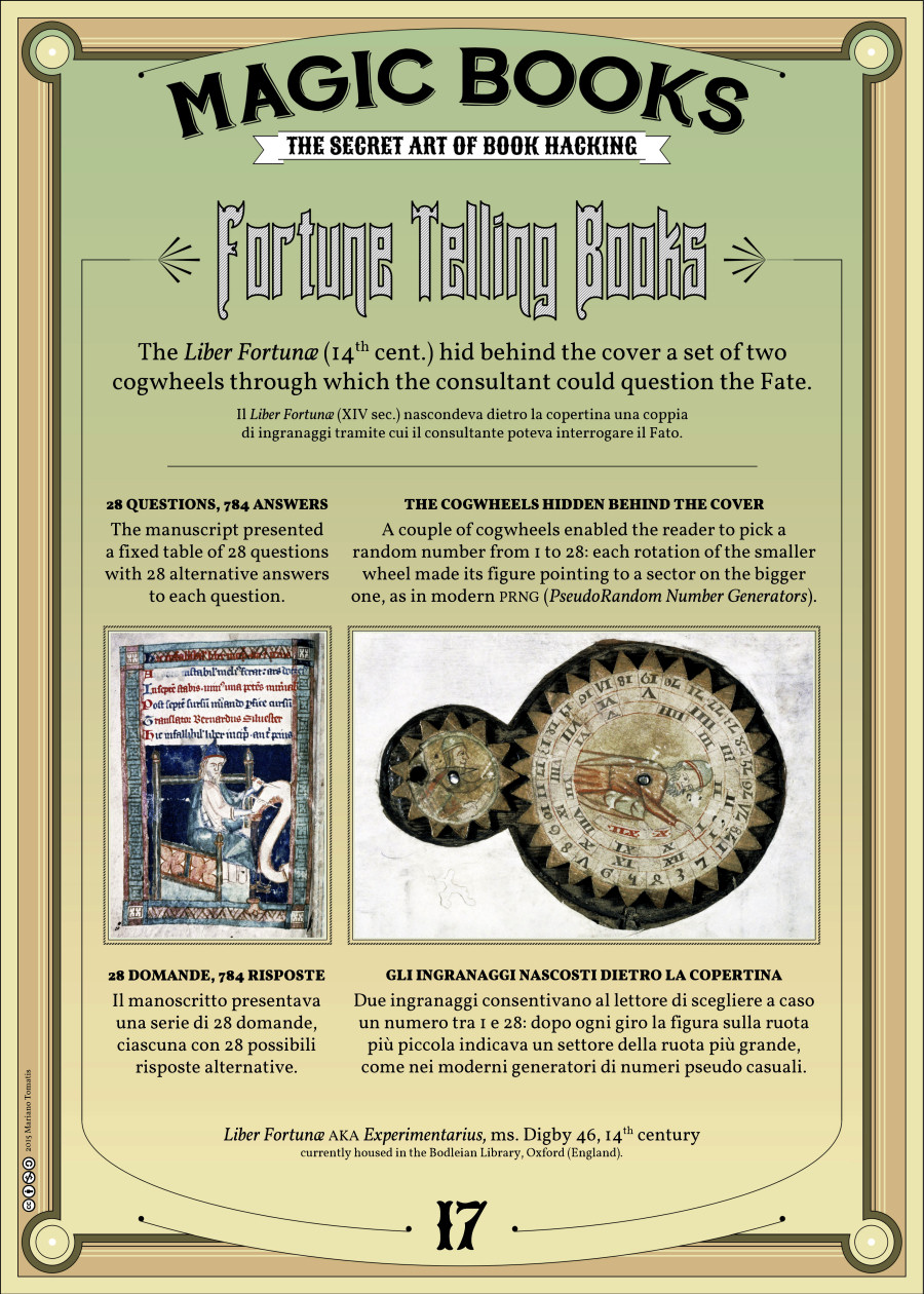 ![]() | Mariano TOMATIS Fortune Telling Books (17 of 30) The Liber Fortunæ (14th cent.) hid behind the cover a set of two cogwheels through which the consultant could question the Fate. |