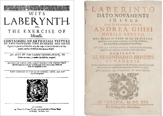 In 1610 the London publisher Thomas Purfoot printed its English translation, entitled Wits Laberynth or, the Exercise of Idlenesse containing an artificiall texture of two thousand two hundred and sixtie figures, so placed and disposed, as by the helpe of a briefe Direction for that purpose, you may tell which of them any man thinketh.