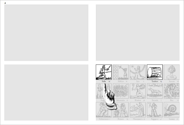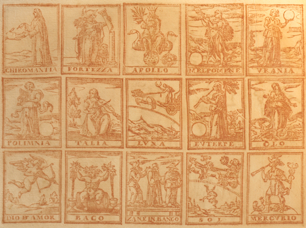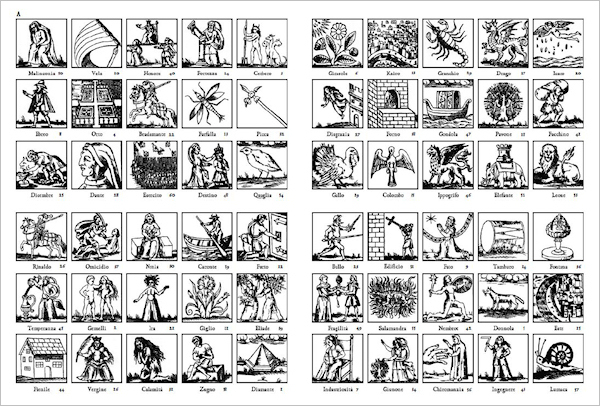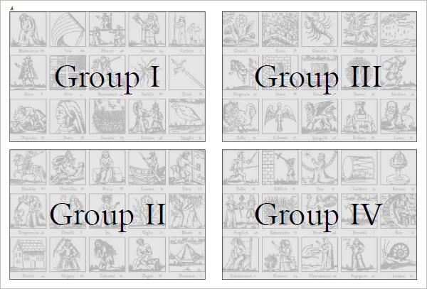 Look at the first image of the group chosen: the first letter of its name will tell you which is the next table. If Tamburo (Drum) is chosen, you’ll be told that the image is in the group IV, whose first figure is the Bullo (Fencer):
