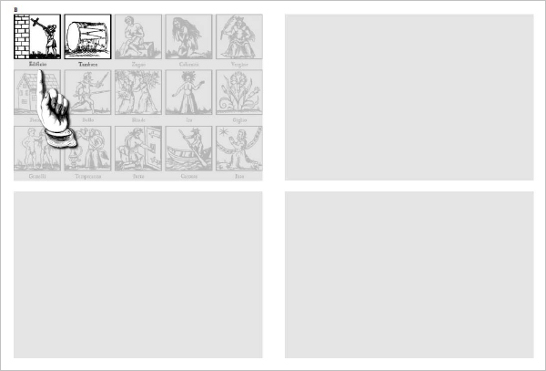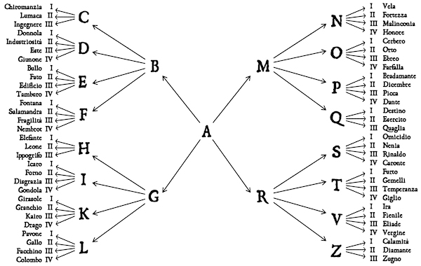 In fact, the structure that unfolds through the 1260 images can be reconstructed with relative ease, based on the assumption that each of the 60 figures is reached through a single path: analysing all of them, it is possible to discover the method used by Ghisi to shape its labyrinth. Since three tables are enough to divine any image, each path can be described with the 3 letters identifying them. In order to divine Tamburo we started from table A, we moved to table B and finally to table E, where the figure appeared in the group IV; therefore the path leading to Tamburo can be identified by the sequence ABE4.