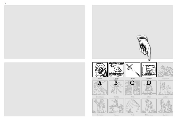 In the example you will be directed to group IV. Look at the first figure in the indicated group: it starts with letter D (Dante). Starting from the first image, spell silently the letter A, then move on the second spelling B, going on until you reach D: the figure you are on is the one which has been thought.