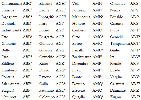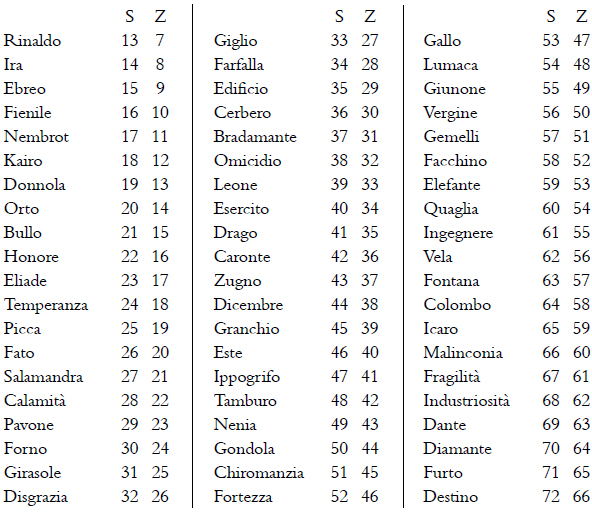 Citing the example provided by Andrea Ghisi himself, suppose that number 40 is thought of. It appears under Honore. The same figure in table M corresponds to number 52. Look up the number in table S and you will find it under Fortezza. The same image corresponds, in table Z, to number 46. By subtracting 6, you get 40, the number thought of.