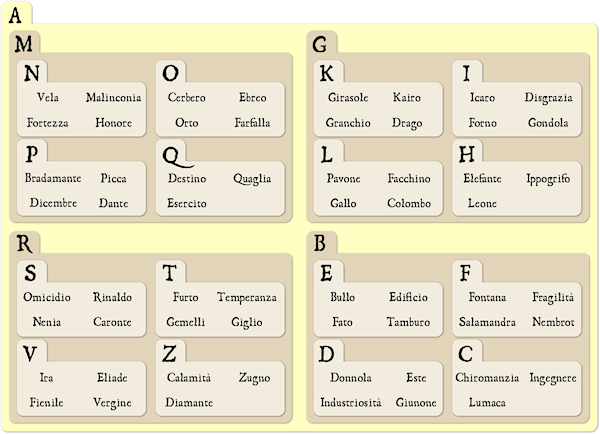 As if it were a file, each table is marked with a label in the upper left corner, and is divided into four groups. Table A presents four sub-tables, each of which contains four sub-sub-tables inside. These contain the names of 4 figures. The map allows you to foresee, at a glance, the path leading to each figure: Salamandra, for example, is in group IV of table A, in group III of table B with a grey background, and finally in group II of table F. Therefore the path towards Salamandra can be expressed as ABF2. If you check it with the actual book, the map allows you to foresee all the groups and tables along the path starting from any other figure. Another way to picture a map of the paths leading to the 60 images is this: