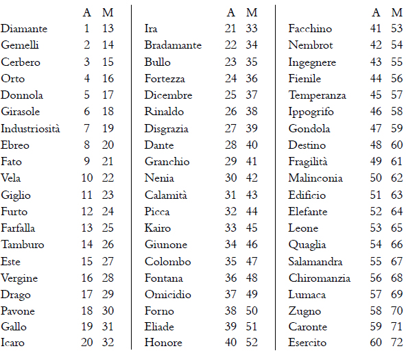 The route to guess the number is deliberately convoluted in order to confuse the player, but we can unravel it to recognize three simple steps. In table A, the numbers from 1 to 60 are listed, each corresponding to a different figure. In table M each figure shows a higher number of 12 units compared to table A. So Diamante, bearing number 1 in table A, in table M corresponds to number 13 (= 1 + 12). This applies to all figures, up to Esercito, which corresponds to 60 in table A and 72 in table M. Therefore table M shows all numbers from 13 to 72.