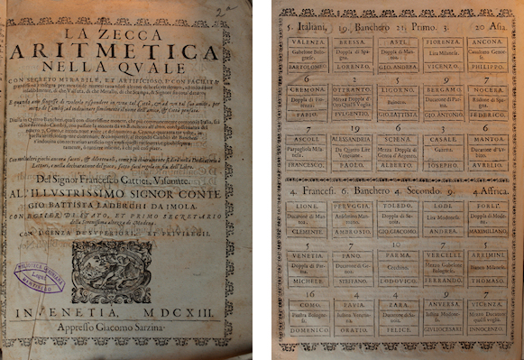 In 1613 viscount Francesco Gattici published La Zecca Aritmetica con mirabile secreto at the Venetian typographer Giacomo Sarzina (20) . This book shares the same structure of Laberinto, with some interesting differences. Printing Gattici’s book was cheaper because there is no figure on it: its 1260 squares show only three distinct series of words. Using the book, the player may choose between three different divinations: the currency of a coin, the name of its owner or the city he lives in. Every square contains the name of currency, the last name of a person and the name of a city.