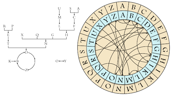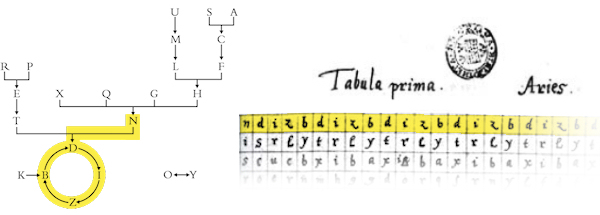 The same arrows appearing on the left graph are reproduced on the right, but since the blue crown-wheel can rotate, the tool can be used to “compute” easily the letters of all rows.