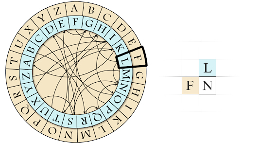 If I have an F in the left and an L over, which letter I shall write in the square with the black border? By rotating the central crown so that L coincides with the external F, I get this arrangement: