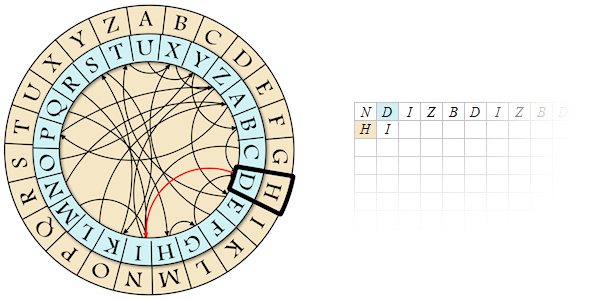 The instrument can be used to solve my problem: What letter should I put on the left which – crossed with the D – “produce” an I? The technique is to turn the crown until, in the fixed background, a arrow linking D to I appears. The rotation is the one that aligns the D and H – so the latter must be the second letter of the seed:
