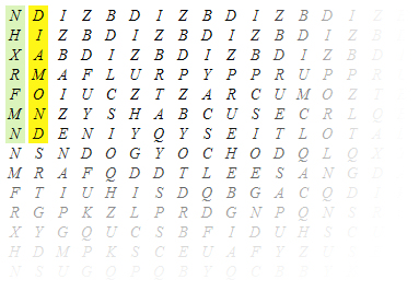 Suppose I want to write the word DIAMOND on the second column. To “produce” the D, the rule that defines the first row suggests that I use N as a seed. (3)