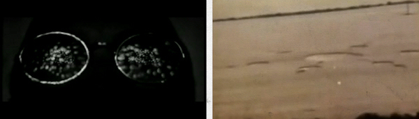 A sinistra: il riflesso della forza nucleare debole che costituisce il dio Azathoth nell’interpretazione di Djie Han Thung (1998) – A destra: due Ball Of Light creano un cerchio nel grano nell’interpretazione di John Wabe (1996).