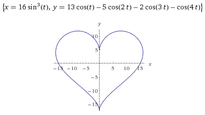 x=16*sin(t)^3, y=13*cos(t)-5*cos(2*t)-2*cos(3*t)-cos(4*t)