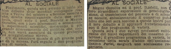 Finalmente, questa sera avremo il tanto atteso debutto delle mondiali compagnie riunite «Teatro del mistero» «Scienze occulte» che, dirette rispettivametne dalle due celebrità, quali sono il prof. Bustelli e Magno Occultis, con i loro interessanti e sensazionali esperimenti scientifici, desteranno il più grande interessamento del pubblico che, certo, non vorrà assentarsi da questo preferito ed arieggatissimo ritrovo.