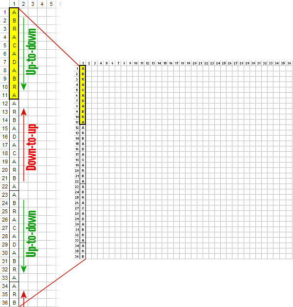 In order to create a page of the book, draw a square grid, consisting of 36 rows and 36 columns. From the upper left corner, write vertically a “magic word”, followed by itself upside down, then back upright, upside down, etc. until you have completed the column. Here’s how to fill it starting from ABRACADABRA:
