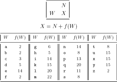 Complex enough, isn’t it? According to the equation, the unknown letter X is obtained starting from the (N)orthern letter and moving on in the alphabet a number of positions determined by the (W)estern letter. Each letter corresponds to a different shift, as indicated in the table above. (The procedure is better explained here.)