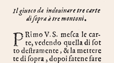 The first reference to this principle, applied to playing cards, appears in a 1593 book written by Horatio Galasso from Arienzo, near Caserta, in the same geographical area where Saviano was born. The method was offered to the reader not for criminal purposes, but to enchant an audience with a demonstration of (alleged) clairvoyance (“The game to guess three cards above three decks.”)