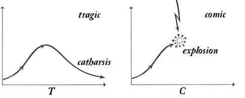 In his book The Act of Creation (2) Arthur Koestler tried to explain what happens in those magical moments where opposites meet. In two charts, the philosopher describes the emotionally trend of the spectator when enjoying a tragedy and a comic situation: