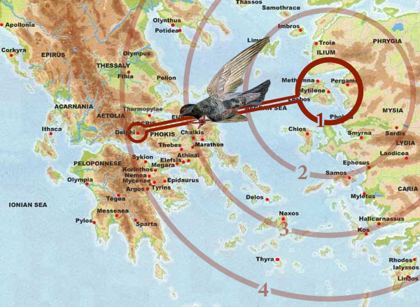 Nel 428 a.C., quando finì la rivolta di Mitilene, la notizia avrebbe impiegato 4 giorni per giungere a Delfi. Questa “mappa di Baricco” mostra le aree progressivamente interessate dalla diffusione della notizia; deformando l’area più piccola, il volo di un piccione viaggiatore dava ai sacerdoti di Delfi tre giorni di vantaggio (o di “preveggenza”).