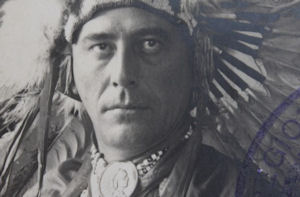Nel 1923 la sua compagnia teatrale viene ingaggiata dalla Paramount Pictures per fare promozione al film di James Cruze “I pionieri”. Lo spettacolo che accompagna la proiezione si intitola “La carovana verso il West” (10) e lui interpreta la parte del pellerossa. Da tale personaggio non uscirà più. Il tour lo conduce in Europa, e a Liverpool inizia a millantare origini nobili: