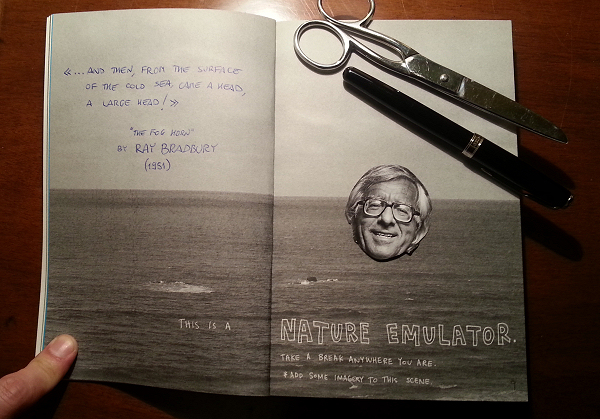 The following pages present a black-and-white view of the sea – a “Nature Emulator” to dive into when you want to take a break. A note suggests adding some imagery to the scene.