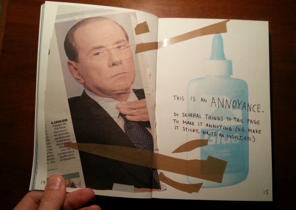 At every page, Keri reinterprets the relationship between the book and the reader, providing continuous occasions for surprise, engaging her with often nonsensical and surreal challenges. The book title itself – reminiscent of Magritte’s pipe – says somehow the truth: what she offers is not an ordinary book; the proposed experiences tickle lateral thinking and never have a single solution. Keri invites the reader to become an author, to collaborate with her in creating a unique piece, challenging seriality and providing a space where – through more and more original contraintes – to unleash creativity in the most bizarre ways.