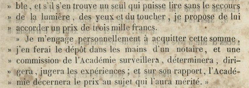 If we find one that can read without the aid of light, eyes and touch, I propose to give him a price of three thousand Francs. I am personally committed to pay this sum, I will deposit in the hands of a notary, and a commission of the Academy will monitor, determine, direct, judge the tests; and after their report, the Academy will award the prize to the subject that has deserved it. (2)