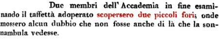 «Two Academy members, at the end, by checking the taffeta discovered two little holes; they raised the suspicion that the somnambulist was looking through them.» in “Premi proposti dalla R. Accademia delle scienze di Parigi”, Biblioteca italiana ossia giornale di letteratura, scienze ed arti, Vol. 92, Milan (Italy), October-December 1838, p. 139.
