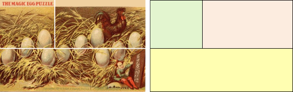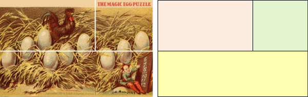 In 1880 the Art Lithographers Wemple & Company (New York) edited “The Magic Egg Puzzle” (1) , a rather curious postcard to be cut in three pieces. In the original arrangement, the picture shows a chicken with 10 eggs: