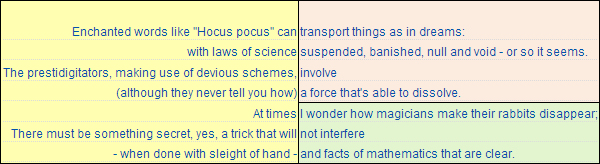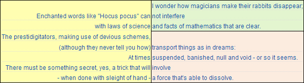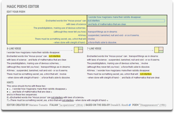 Some days ago Knuth’s poem has been featured on Futility Closet blog; in the occasion I have worked on an Italian adaptation of the text. In order to ease my task, I have created a Magic Poems Editor, an online tool which help in keeping track of the internal constraints. A rather Oulipian exercise!