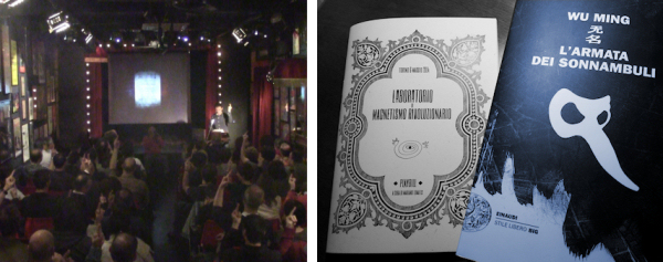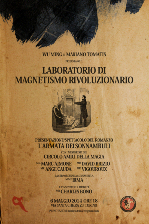 If a magician is nothing more than a storyteller with special effects and if there is no magic trick not telling a story, literature and magic share deep roots. In order to explore the fruitful hybrid, together with Wu Ming we have created a theatrical experience – the Laboratorio di Magnetismo Rivoluzionario (“Laboratory of Revolutionary Magnetism”), presented on 6 May 2014 in the theater of the Circolo Amici della Magia in Turin, Italy. The show involved readings from the book, interactive exercises involving the audience, comments by the authors, magic tricks performed by a collective of 6 magicians and even a somnambulist with her medium in a typical Second Sight performance. (2)