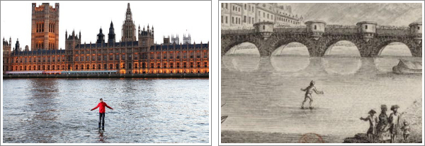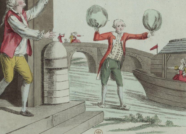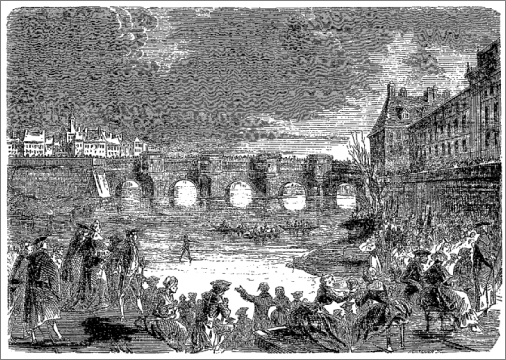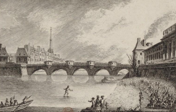 On 25 June 2011 the British magician Steven Frayne, best known for his TV appearnces on the show Dynamo: Mission Impossible, has been seen walking across the river Thames. Many have compared Dynamo’s stunt to Jesus’ miracle (Matthew 14:22-33; Mark 6:45-52; John 6:15-21) but not many know that an engraving dated 1783 shows a similar scene; set in Paris, it represents a man walking across the river Seine.