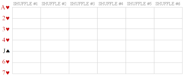 You can point out that the graph is complete, and covers the entire history of the card, even for a larger number of mixtures: since the card returns to the first position, the graph drawn by the students is cyclical; if the 1♥ is in 4th position after 2 shuffles, it will be in the same position after 2 + 6 = 8 suffles, 2 + 6 + 6 = 14 suffles and so on. The “frequency” of the route through the deck is equal to 6.