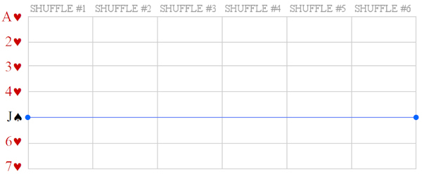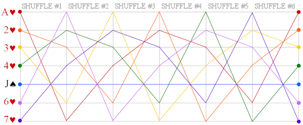 Another interesting point is that the route taken by the six “moving” cards is the same: if a card is in the first position, after the next shuffle will end up in last place, regardless of how many shuffles have been made so far; the different routes are simply shifted one to another.
