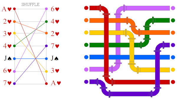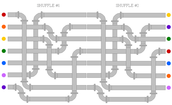 To study the effect of two shuffles is to apply twice the function to the starting vector – or more easily, to put two series of identical tubes and see the effect on the balls through them: