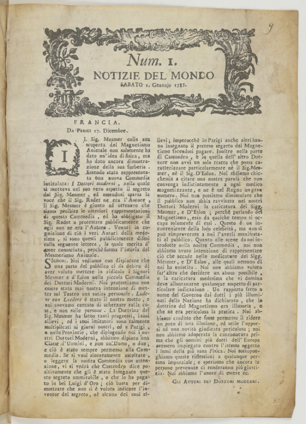 Nel 1784 a Parigi si parla solo di Franz Anton Mesmer: tutti vogliono partecipare alle sue spettacolari “cure magnetiche”, sebbene due commissioni scientifiche abbiano appena decretato che il “magnetismo animale” non esiste. Ad approfittare del dibattito sono i Commedianti Italiani Ordinari del Re, che al Théâtre-Italien mettono in scena “I dottori moderni”, un’opera buffa che prende in giro Mesmer e i suoi seguaci. I magnetisti non la prendono bene e sui giornali scoppia una viva polemica: il diritto di satira consente di prendersi gioco di terapie mediche e disperati in cerca di guarigione?