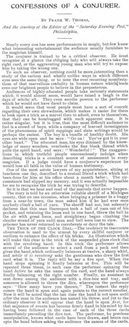 Tra ottobre e dicembre 1901 la rivista Magic pubblicò in tre puntate questo articolo di Frank W. Thomas intitolato “Le confessioni di un prestigiatore”. I tre articoli sono accessibili nella Biblioteca Magica del Popolo e qui di seguito in traduzione.