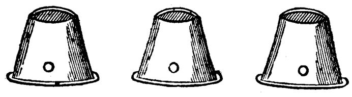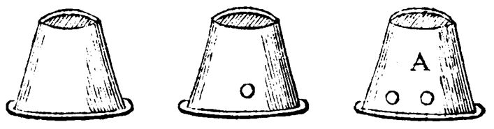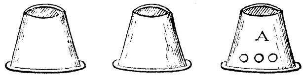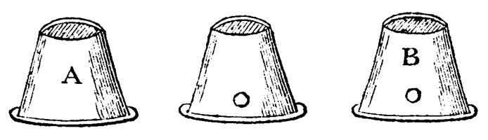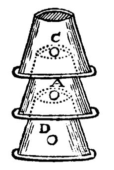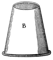 Il Prestigiatore che voglia onorarsi di tale titolo deve possedere attrezzi d’ogni genere tra i suoi strumenti, e prima di ogni altra cosa deve avere tre coppe o bussolotti, siano essi di ottone o di latta. Tali bussolotti devono esser tutti della stessa dimensione; nella seguente immagine sono ben rappresentati la loro forma e misura, indicati con la lettera B.
