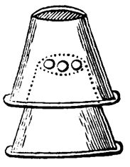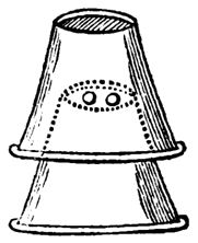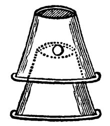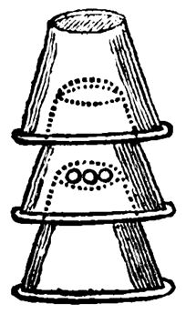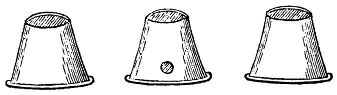 A questo punto si prende un bussolotto nella mano destra e lo si mette capovolto sopra a un altro, dicendo: «Vedete Signori, metto un bussolotto sopra l’altro», e nel farlo si introduce segretamente la pallina tenuta nella mano destra sopra il fondo del bussolotto inferiore: si osservi la figura seguente.