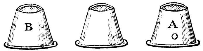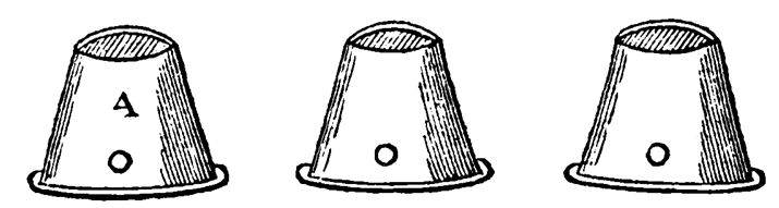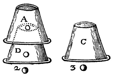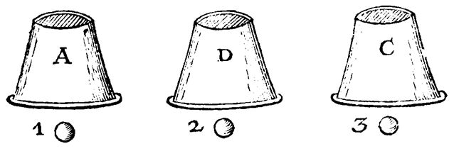 Infine si sollevano i bussolotti in sequenza, concludendo così: «Signori, ecco di nuovo la prima, la seconda e tutte e tre.» E nel riporre capovolto l’ultimo bussolotto indicato con la lettera A, vi si introduce segretamente la pallina tenuta nella mano destra.