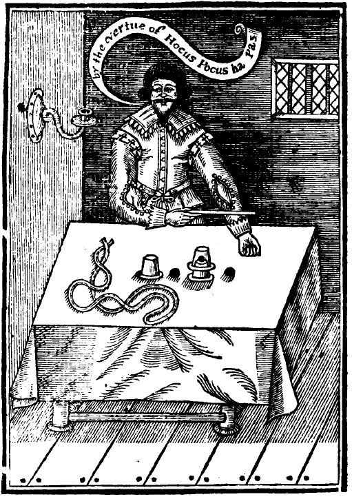 l’autore raccomanda ai suoi lettori che nell’esecuzione di trucchi di destrezza si usino imbonimenti o formule come le parole “hocus-pocus” (hoc est corpus), “hiccius Doctius” (hic est doctius), “vade couragius” (vade cor ejus?), “revoca stivoca” (revocasti voces?) e molte altre, senza apparentemente la minima idea che stava corrompendo le parole di qualche rituale latino. (2)