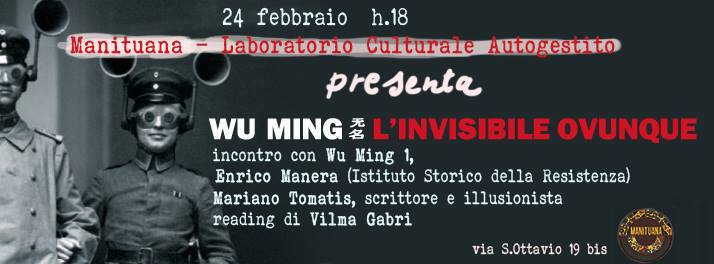 L’invisibile ovunque (Einaudi 2014), l’ultimo libro di Wu Ming, è una riflessione sulla guerra che non disdegna – e anzi, impiega in modo lucido – suggestioni irrazionali, spiazzanti e stuporose. Se contro la follia dei conflitti armati è lecito fingere la pazzia, rifugiarsi nel surrealismo o sparire come gli illusionisti, allora mi sento a casa – io, che da sempre mi occupo di ciarlatanerie ed espressioni teatrali tipiche della cultura più bassa e popolare.