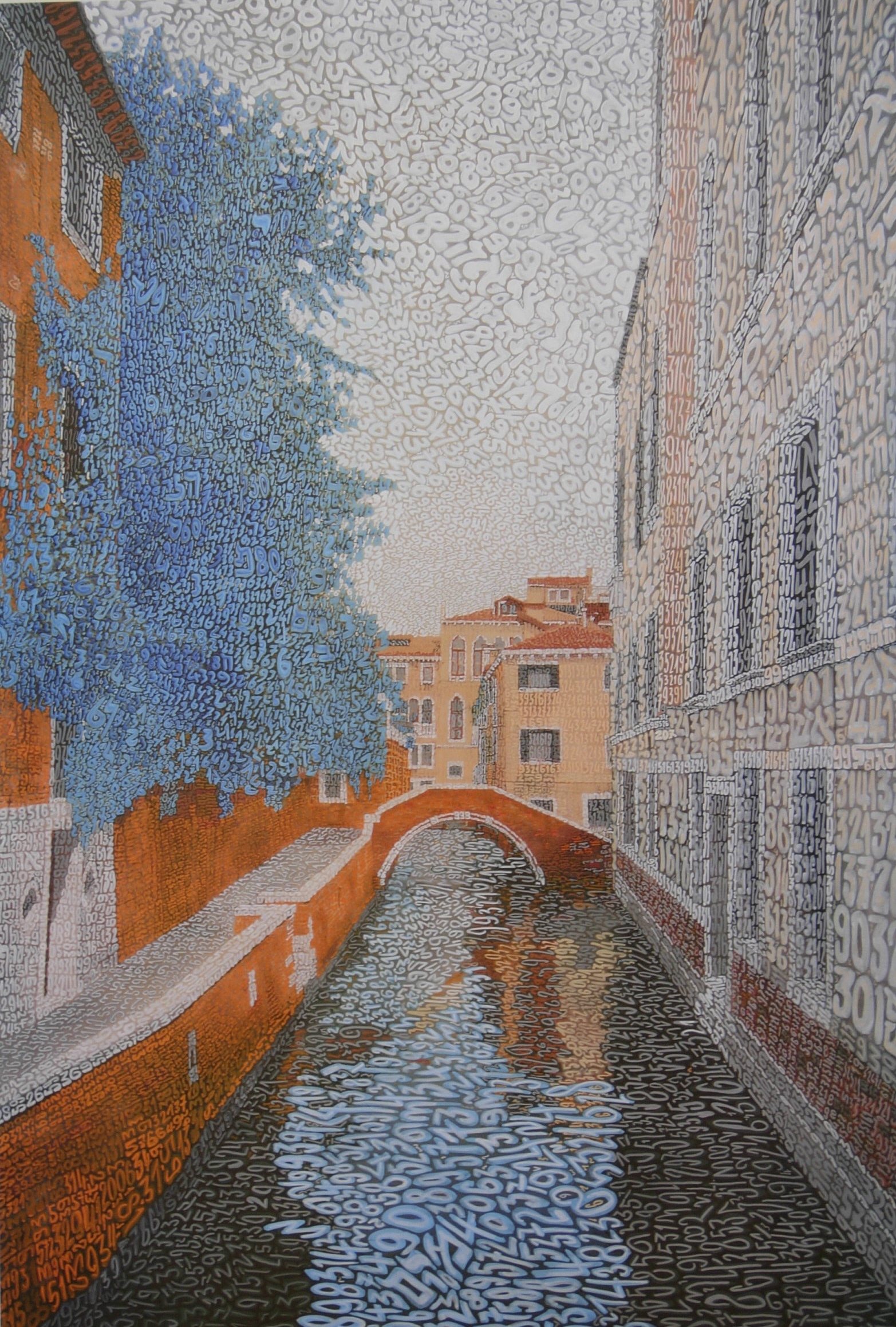 Forget about Matrix and its falling green digits: Tobia Ravà’s views of Venice are made up of numbers and Hebrew letters since 1971. Disciple of Umberto Eco, he obtained a degree in semiotics and is now involved in lectures, given in Universities and Superior Schools of Art, based upon his activity in the context of Hebraic culture, of mathematics logic and contemporary art. Elisabetta Donaggio hosts in her gallery “L’occhio” a number of his works. It is located in Dorsoduro 181/185 (See on the map).