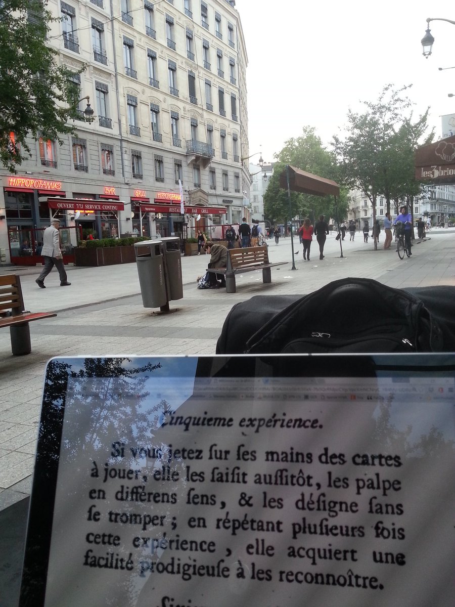 I’m shivering leaning against a pole. An elderly woman stops and asks: “Monsieur, vous sentez-vous bien?” I’m not sure. I try to look at her face, but I only see the dark. In the darkness, I sense a coin; perhaps it lies in a pocket: maybe yours? I close my right hand, as if I was holding a pen. Then, for a brief moment, I see a mobile phone: it is in front of me, and it is as if I could look at it through your eyes.