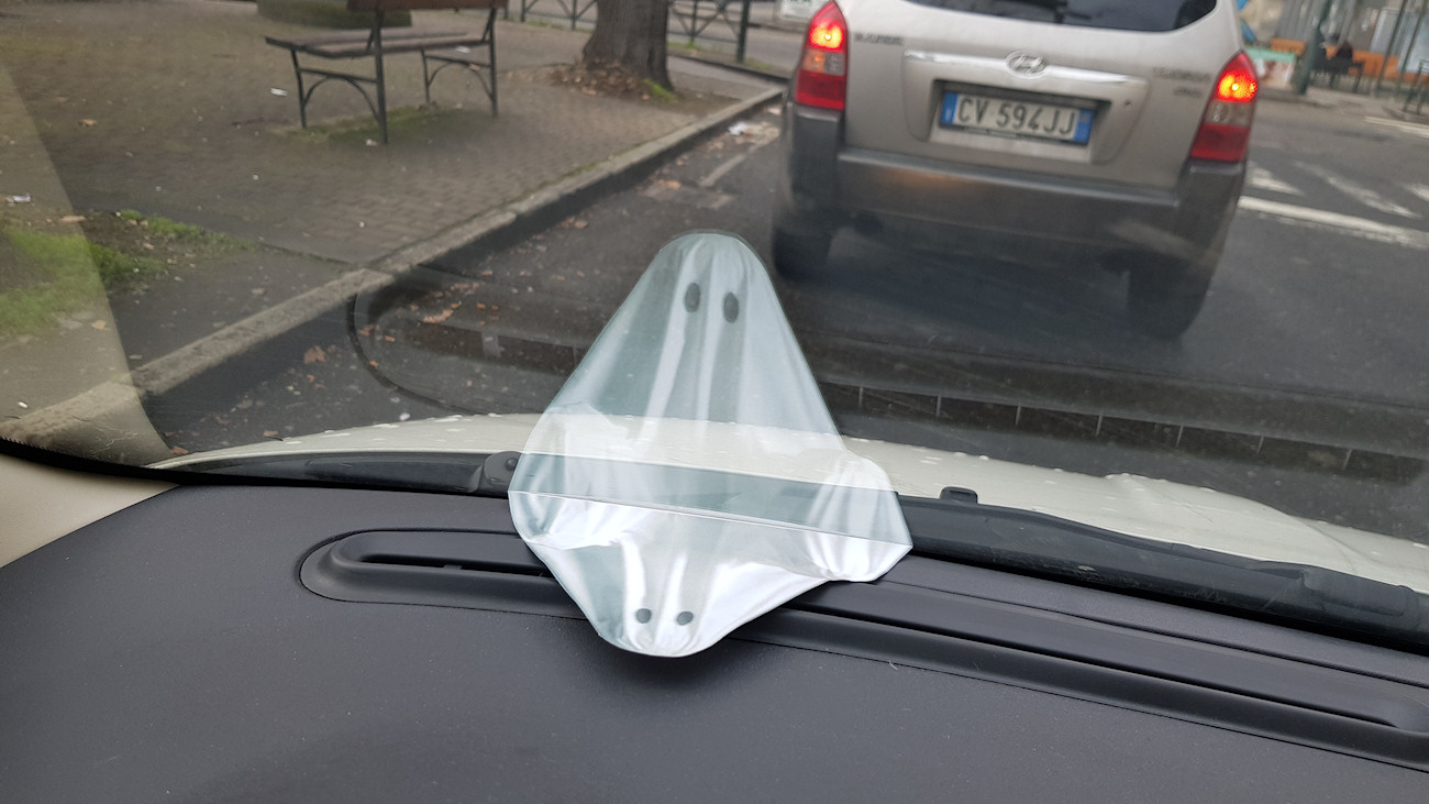 Insert the paper ghost inside the car between the glass and the dashboard, where you usually put the parking ticket.